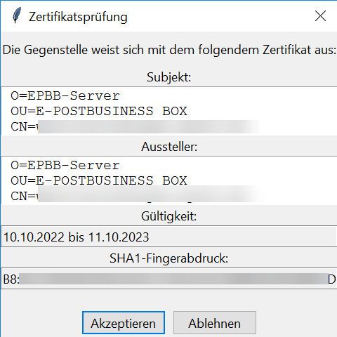 Loggt man sich das allererste Mal auf dem ePost-Account ein, kommt noch eine sogenannte Zertifikats-Meldung.Diese einfach mit "Akzeptieren" bestätigen.Danach sollte der Epost-Druckdialog sich öffnen.